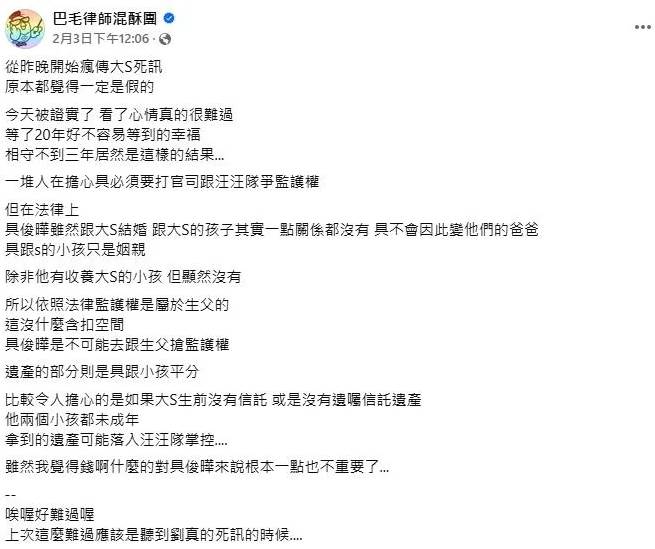 網紅「巴毛律師」陳宇安在臉書提到,大S等了20年好不容易等到的幸福,相守不到3年竟傳憾事,「一堆人在擔心具必須要打官司跟汪汪隊爭監護權」,所以他特地發文回應此事。