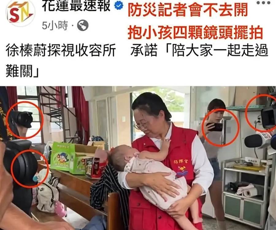 引發熱議的第四張「擺拍超人」,捕捉到一位身穿「志工」紅背心的女性,正刻意抱著嬰兒配合拍照。