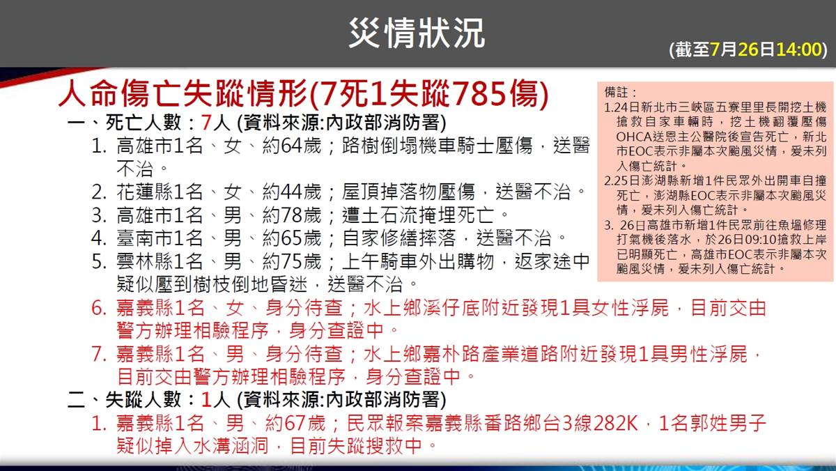 交通部中央氣象署今天上午8時30分已解除凱米颱風的颱風警報,但隨著外圍環流和西南風的影響,台灣南部地區的天氣狀況仍然不容樂觀。根據中央災害應變中心的統計,截至下午2時,凱米颱風及其後續影響已經造成7人死亡、1人失蹤和785人受傷。
