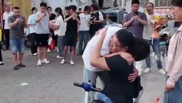 無腿父親看到這一幕,先是訝異,而後很快反應過來,父子倆深深相擁,圍觀群眾都看得鼻頭一酸。
