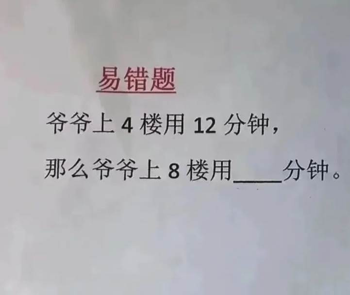 一名網友就分享了一道小二的數學題目,只見上面寫著:「爺爺上4樓用12分鐘,那麼爺爺上8樓用_分鐘?」上面還有紅字標註這是一道易錯題。