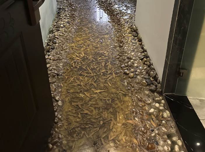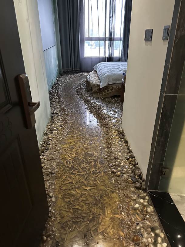 網友紛紛笑翻表示:「以為是廁所堵了下水道屎流出來了」、「充滿臭水溝子的房間…」、「我動森的房間就長這樣」、「主要感覺不是山清水秀,而是髒兮兮」、「關鍵是這坑坑窪窪的,打掃得乾淨嗎?」、「不用打掃,反正掃不掃效果都一樣」、「哥們 這純臭水溝啊」、「看了想分手」、「你這個睡覺就感覺像上墳一樣」