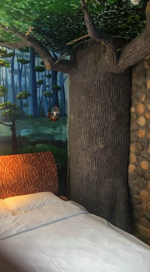 原PO最後為了哄女友開心,急忙取消訂房並訂了另外一個房間,但沒想到這間房間是超級叢林風,床的旁邊甚至有一截超大樹幹,根本像進入了白雪公主的世界XD