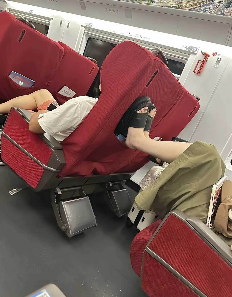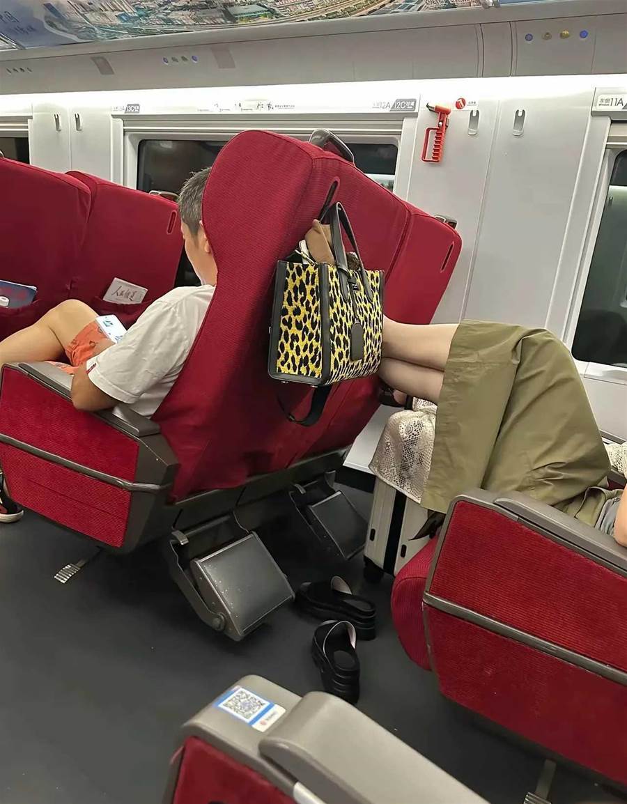捷運一等座上,一名打扮時髦、衣著光鮮的女子登上捷運一等座後,便毫無顧忌地脫掉腳上的高跟鞋,隨手換上了一雙一次性拖鞋。緊接著,她徑直將雙腳高高抬起,穿著拖鞋的鞋底直接抵在了前方座椅的椅背上,這一動作持續了不短的時間。