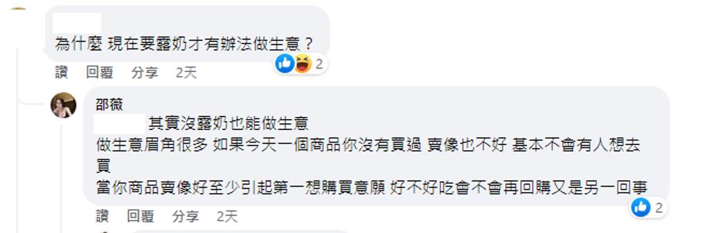 但也有酸民看不慣,留言問:「為什麼現在要露奶才有辦法做生意?」邵薇見狀,不但沒有生氣,還理性地回覆:「其實沒露奶也能做生意,做生意眉角很多,如果今天一個商品你沒有買過,賣像也不好,基本不會有人想去買,當你商品賣像好,至少引起想購買意願,好不好吃會不會再回購又是另一回事。」也自爆芳齡20幾歲,已在這行業待了一半的時間。