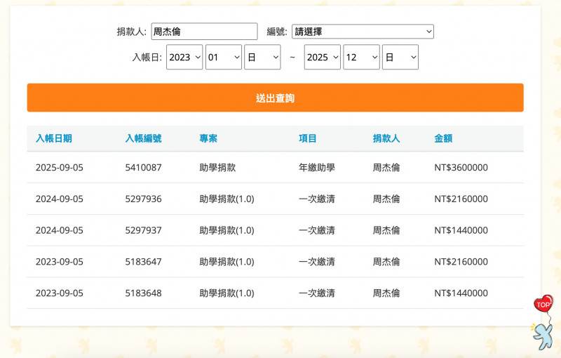 46歲的「亞洲天王」周杰倫,不僅在台灣樂壇極富盛名,就連私下善舉也在近日被挖出。日前,一名網友偶然翻看周杰倫過往的捐款紀錄,發現在富邦慈善基金會「用愛心做朋友」專案中,芳名錄竟有周杰倫3字,且每年固定捐贈360萬,至今已17年之久,總計捐贈6千多萬給弱勢學童,但這些年始終低調、不張揚,瞬間引發熱議。