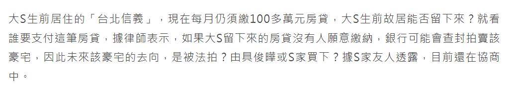 大S離世后,她留下的價值過億的信義區豪宅,還需要交納每月上百萬台幣的房貸,此前,台媒稱,具俊曄與大S的一雙子女作為該豪宅的繼承人,照理說應該承擔該房貸。