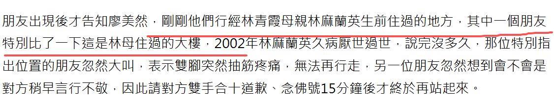 原來,朋友來赴約的路上,路過了林青霞母親麻蘭英以前住的地方,其中一個人指著那房子說:「這是林青霞媽媽住過的地方,她2002年因厭世病走的。」
