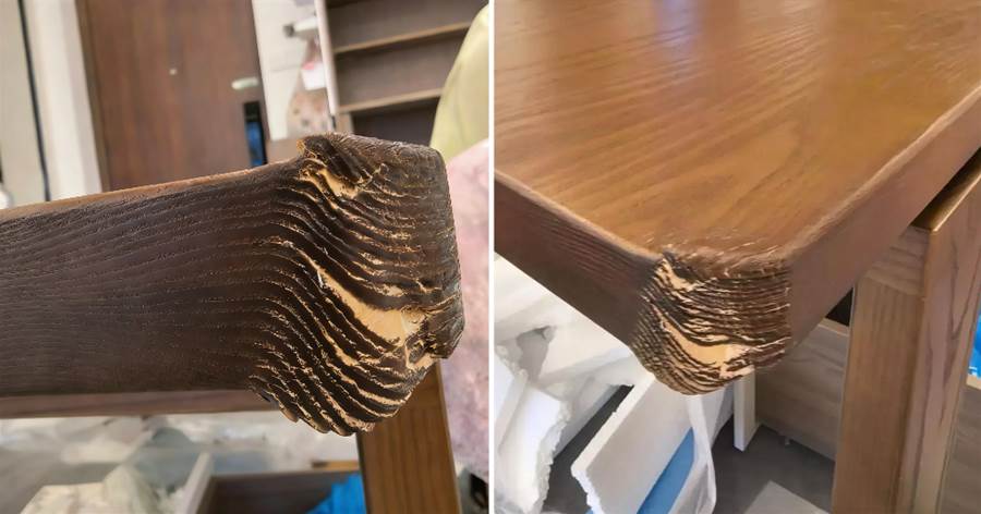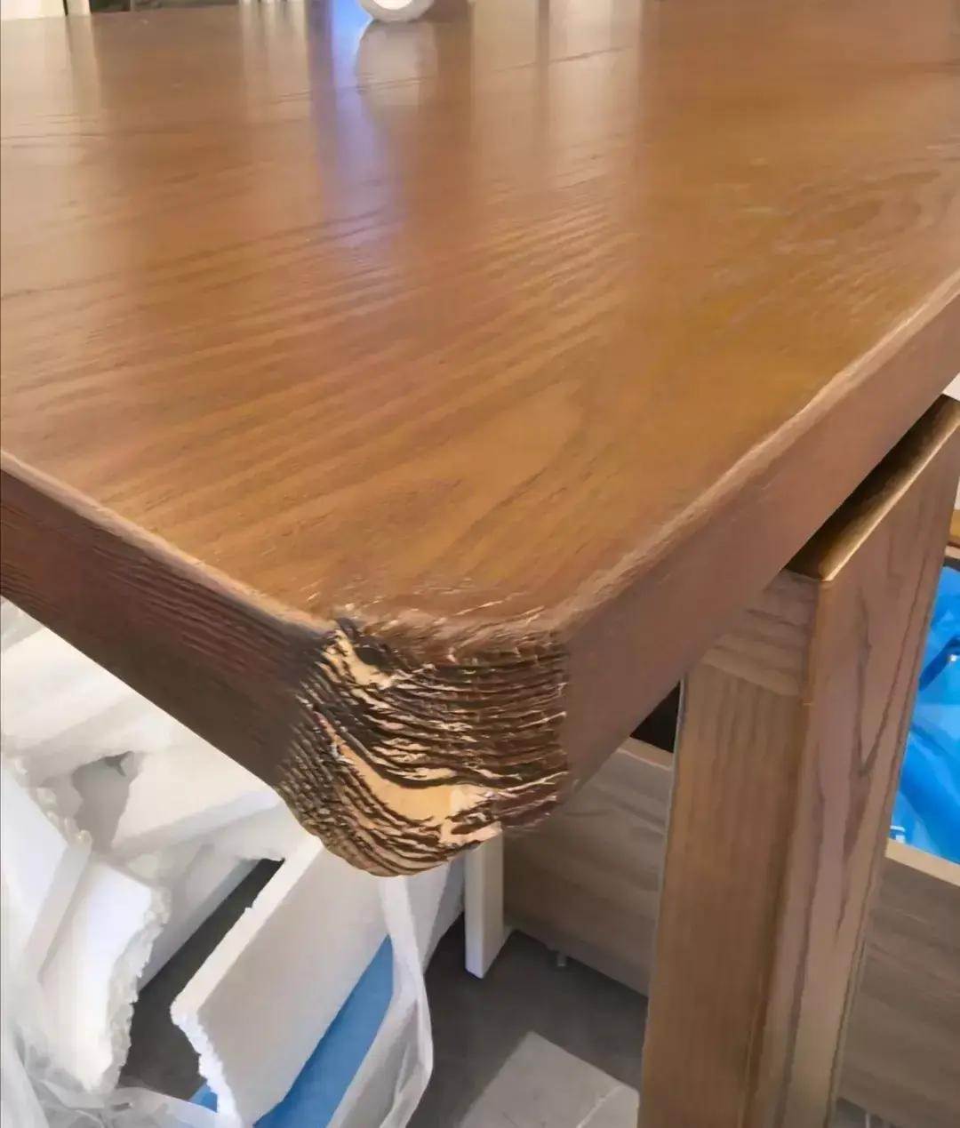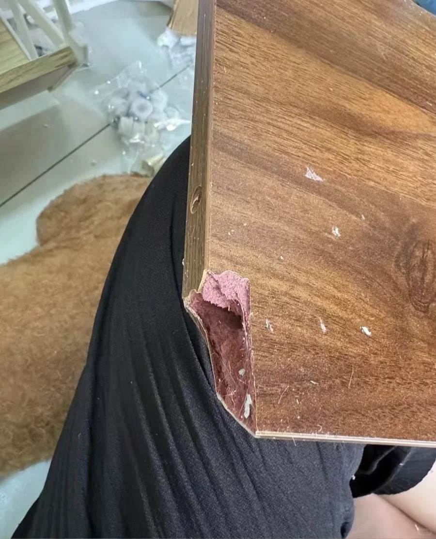 網購了一張3800塊號稱「非洲柚木原木桌」的原木桌。就在周六下午,我家娃推著玩具車在客廳玩,不小心輕輕蹭了下桌角。本以為頂多留個小印子,結果「咔嚓」一聲,桌角直接掉了一小塊皮,里面露出來的居然是發白的密度板!我當時人都傻了,湊近一看,整個桌面就是密度板外面貼了層仿柚木的貼紙,用手一摳都能掉渣。