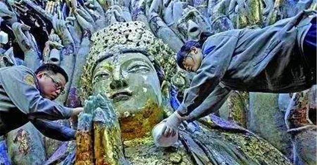2011年重慶工人正在維修中華有著800多年歷史的摩崖石刻千手觀音造像,它乃集雕刻、彩繪、貼金于一體,是世界范圍內最為精美的大足石刻之一,被人們稱為「石刻藝術瑰寶」。