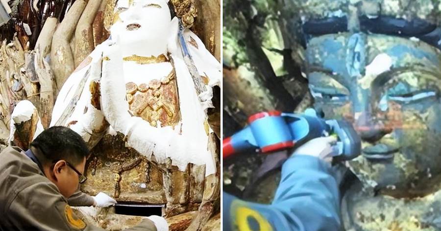 大足石刻觀音石像的修復主要採用的是從中間往兩邊蔓延的方案,于是對石像軀幹的修復工作安排在了第一個工期完成。「咔噠」,一聲沉悶的聲音讓在場的修復人員全都停下來手頭上的工作。這處機關位于石像的正腹部,長30公分,寬8公分,十分隱蔽,不仔細看根本看不出來。