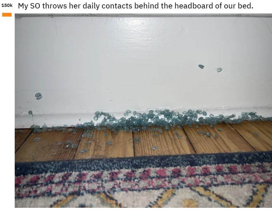 美國男子費爾·羅特 (Fire Rotor) 在網路論壇Reddit發文表示,他的女友把用完的日拋隱形眼鏡摘下後,不是丟進垃圾桶裡,而是隨手扔在床頭板後方。結果他掀開床頭一看,木頭地板和白色牆壁上黏著滿滿的隱形眼鏡,甚至形成了一座「隱形眼鏡小山丘」。