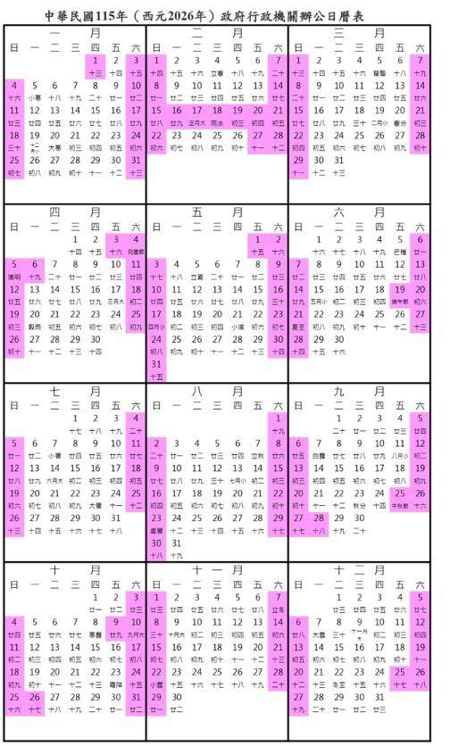 2026政府行政機關辦公日曆表。(圖/行政院人事行政總處)