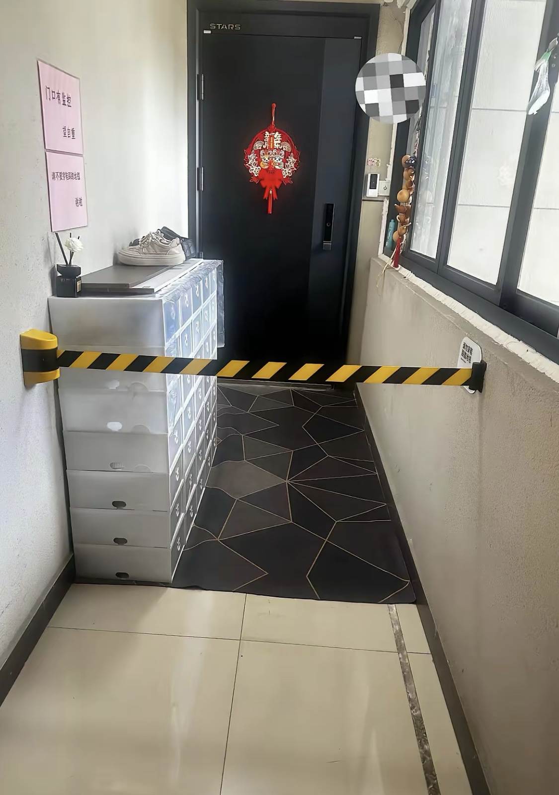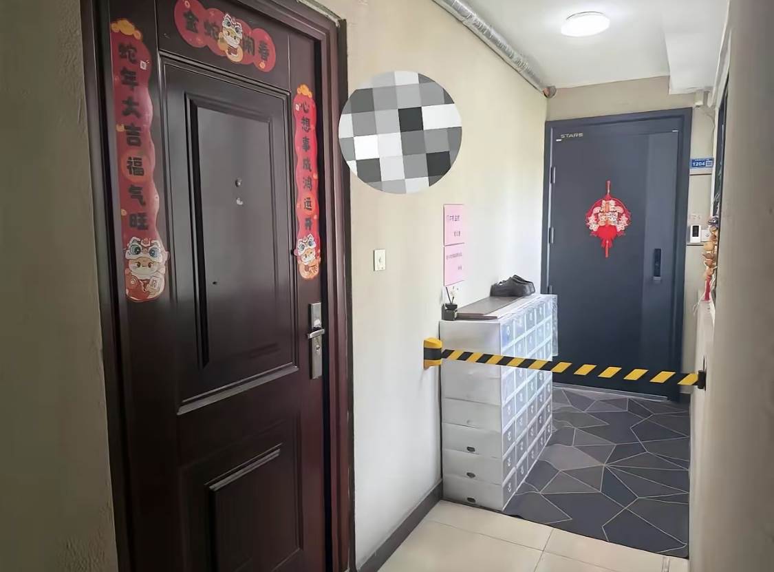可這次的「黃線事件」,顯然是升級了。那根拇指粗的黃線從他家門框拉到樓道牆根,把半條公共通道圈成了「私人領地」。線旁邊貼著兩張A4紙,一張印著「門口有監控,望自重」,另一張寫著「請不要穿鞋踩踏地毯」——而所謂的地毯,正鋪在黃線圈起來的公共地面上。