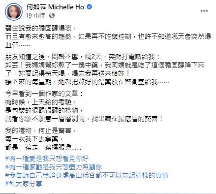 不過有朋友知道後,也馬上打電話關心,更推薦了自家阿姨服用的中藥,覺得也是類似的問題而改善很多,更不厭其煩地每天都把燉好的中藥,送到警衛室給她,讓何如蕓感動地說,每次下樓去拿藥時,都會一邊走一邊擦乾眼淚:「有一種愛是,『我只想看見你好』;有一種感動是『我只想盡力照顧你』!」更表示無論自己之後是身處在高山,還是跌到低谷,都不能忘記對方這樣的真情付出。