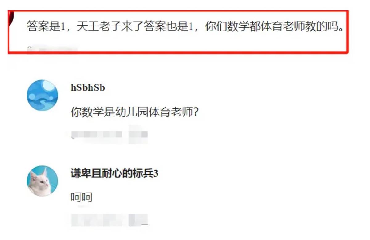 ,認為也可能是對方判卷出錯了!于是言之鑿鑿地質問:這道題哪怕天王老子來了,也等于1,到底是家長沒文化還是老師沒文化?這麼簡單的題也給批錯了?
