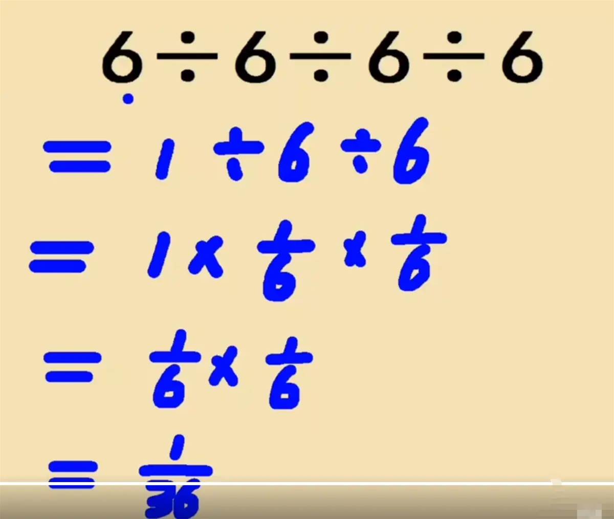 這位山東家長在輔導作業時看到這道題,也是非常自信地給出了自己的答案:因為6÷6等于1,所以無論6÷多少個6,結果都是1。