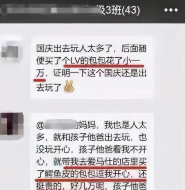 畢竟在家長群里,老師即便很無奈,也沒好意思多說什麼,不一會又一名家長也不甘示弱,將自己名貴的包包,也曬了出來,這下子好了,有的曬「手辦」,有曬豪車的一發不可收拾。