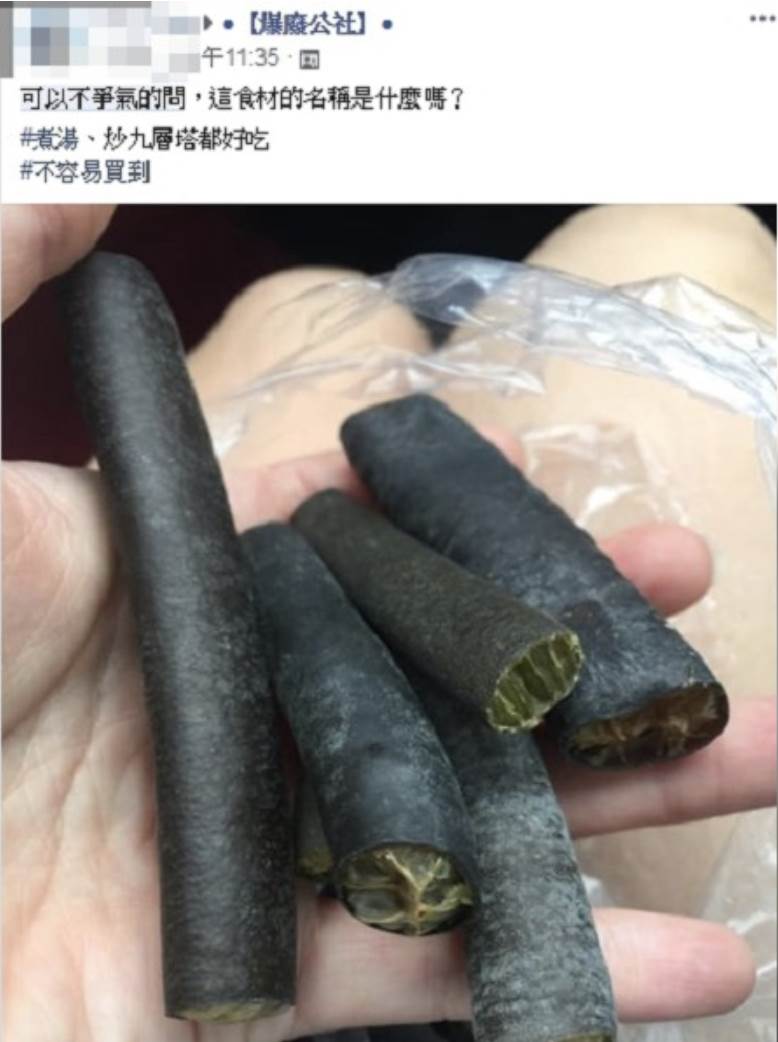 根據TVBS新聞網報導,原Po在臉書「爆廢公社」上放出一張照片,附文問道「可以不爭氣的問,這食材的名稱是什麼嗎?」之于,還不忘提示,這個神秘的黑色食材,無論是炒九層塔或煮湯都很好吃,但可惜的是平時很不容易才能買到。