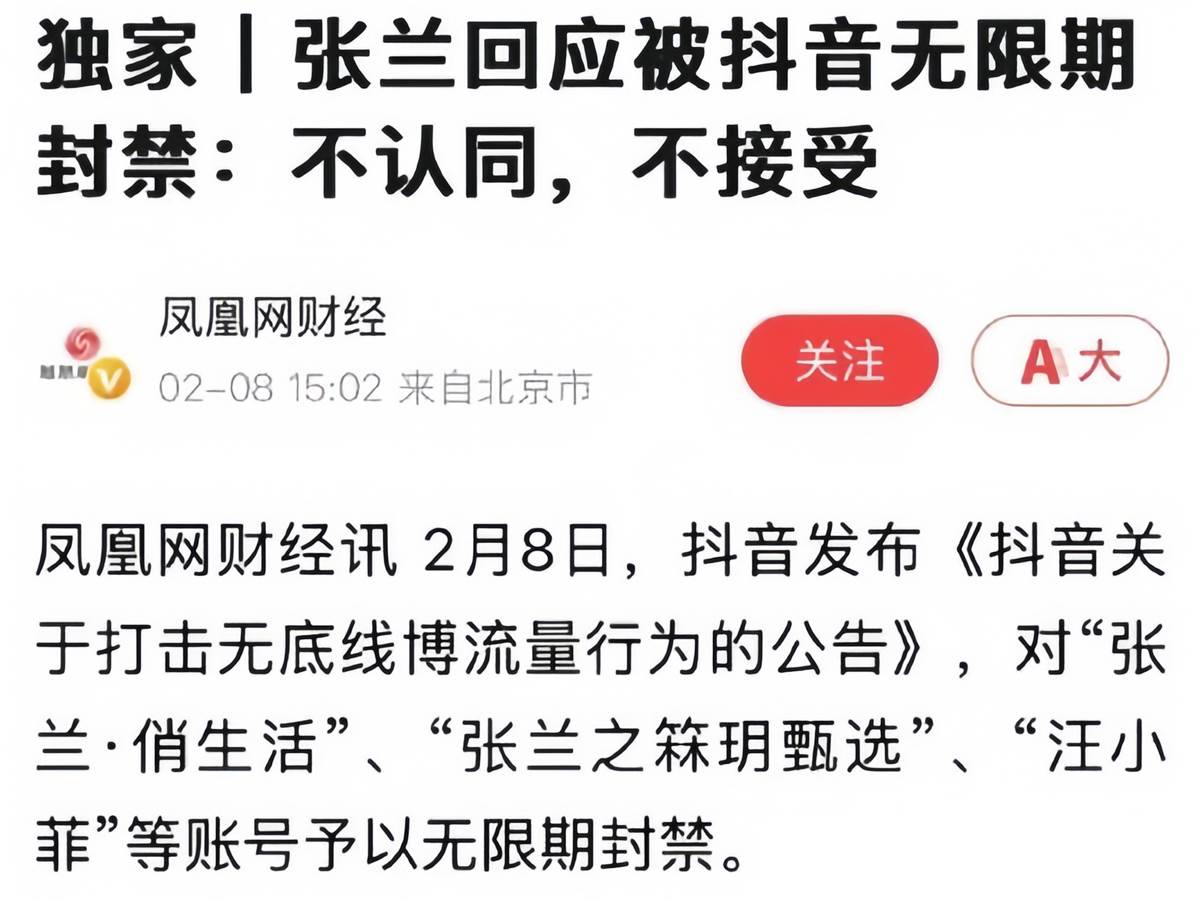 如果張蘭申訴成功,就證明抖音自己在打自己的臉。抖音封禁的名人、資本多了去了,你們見過誰解封過?這個事情,張蘭自己想不明白嗎?