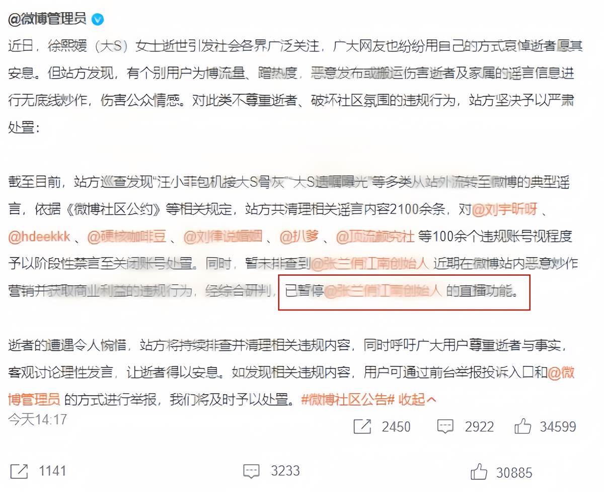 現在,微博也開始行動了,雖然張蘭的微博沒有被封禁,但是張蘭的直播功能已被暫停。如果張蘭繼續作下去,離全網封禁也不遠了。