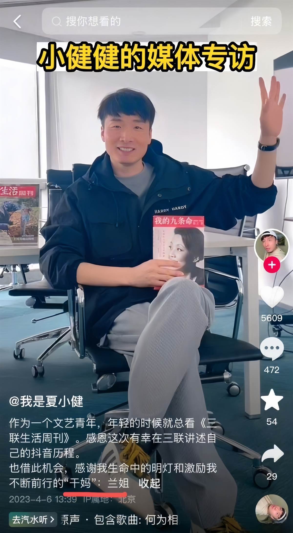 可是眼尖的網友發現了端倪。2023年4月6日,「我是夏小健」在三聯講述自己的抖音歷程時,明確感謝自己的「干媽」蘭姐。兩人多次在直播間互動,張蘭并未否認自己干兒子的說法。為什麼出事之后,要與干兒子劃清界限呢?看來干兒子就是不如親兒子親啊,賺錢的時候不分彼此,出了問題,便只能舍棄了。得虧互聯網有記憶,要不然怎麼說得清楚哦。