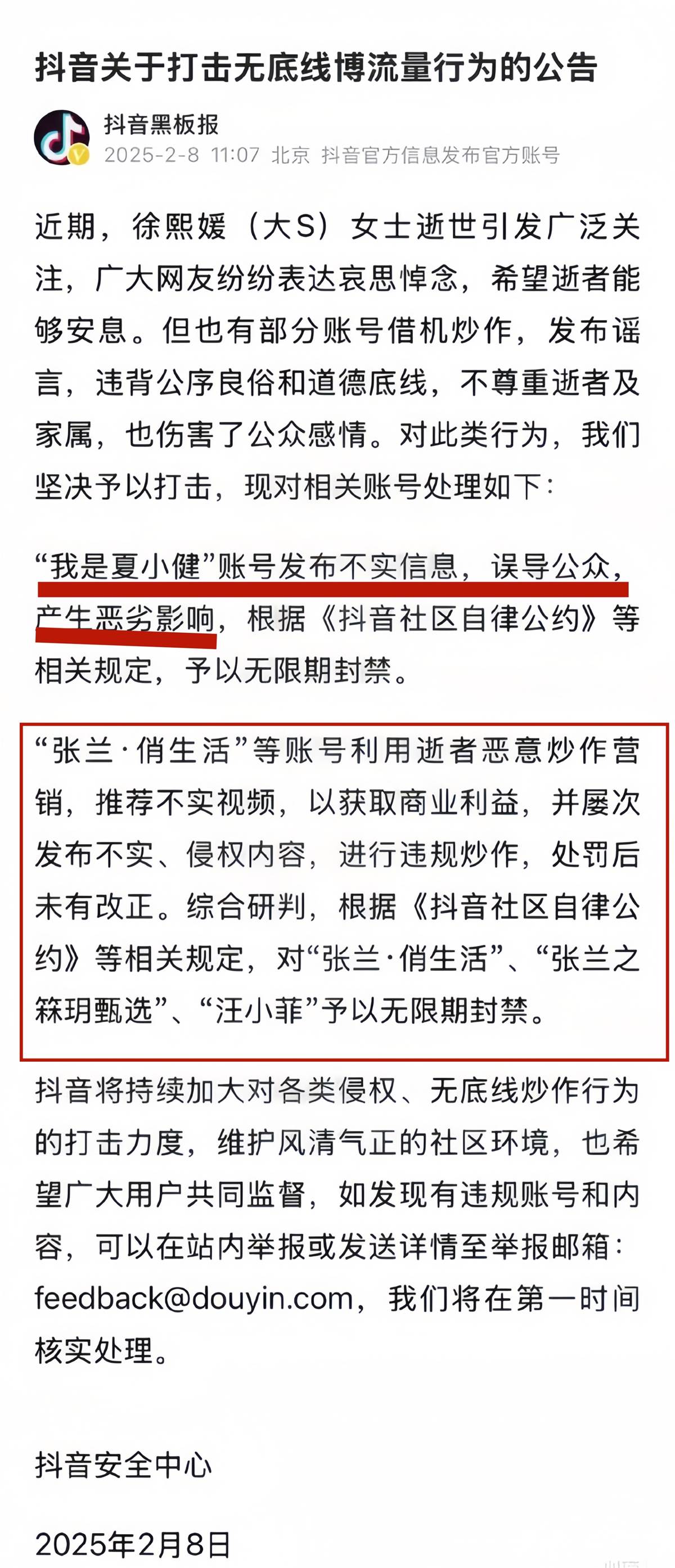 2月8日,張蘭母子抖音號被封事件登頂各平台熱搜榜單。