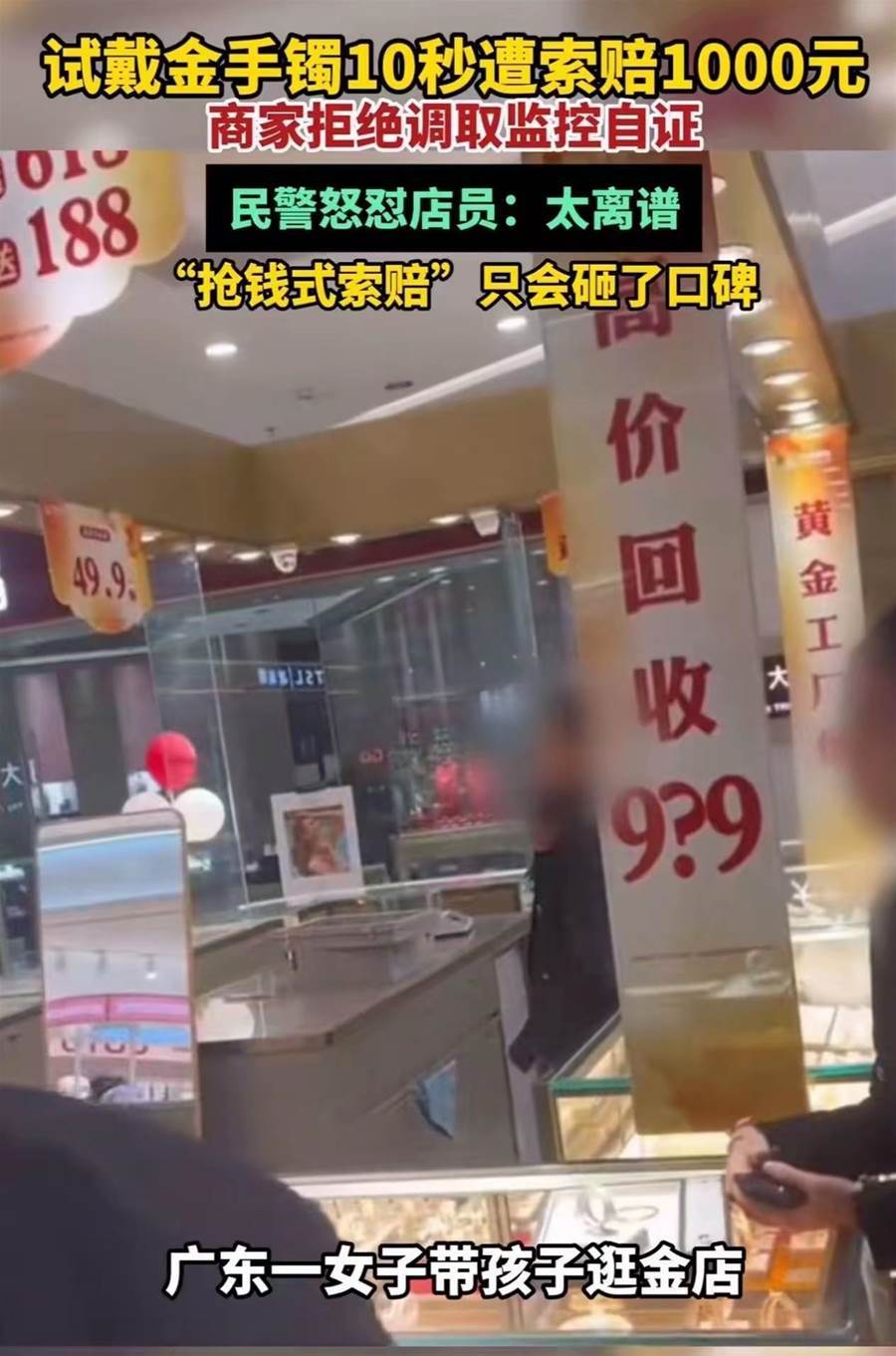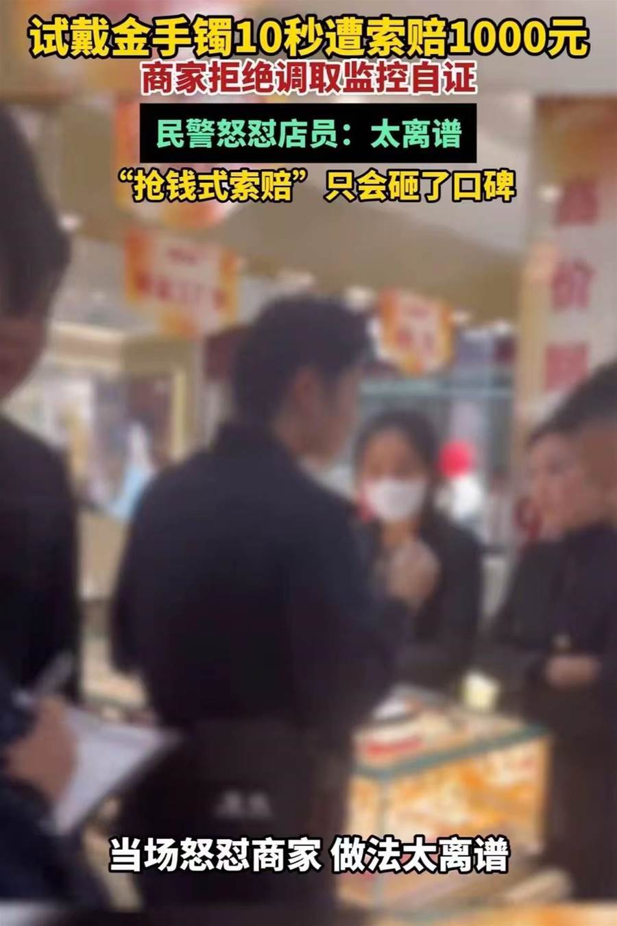 員警趕到後,先查手鐲再問情況。聽到店員堅持要1000元,當場怒了:「太離譜了!這手鐲連變形痕跡都沒有,你們明擺著訛人,想錢想瘋了?」他舉著手鐲對燈光照了照,轉頭警告店長:「消費者正常試戴沒故意損壞,憑啥索賠?這是侵犯權益,再鬧別開店了!」