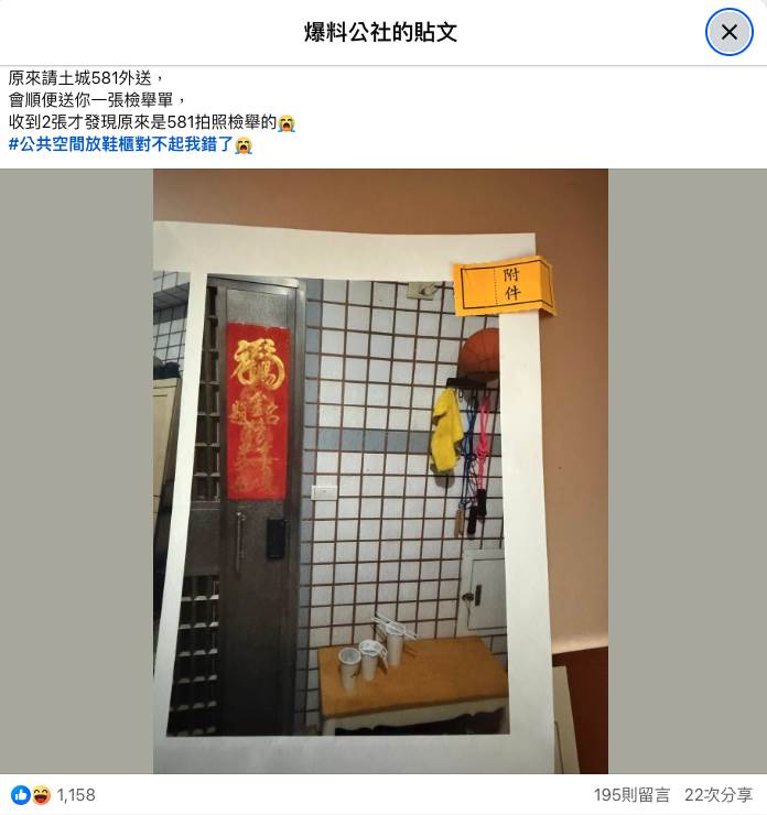 沒想到幾天後民眾卻收到一張「罰單」,他才知道被報復了!這位民眾收到一張罰單通知,原因是他家門口的鞋櫃被人檢舉佔用公共區域,必須繳交高額罰款。