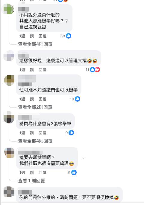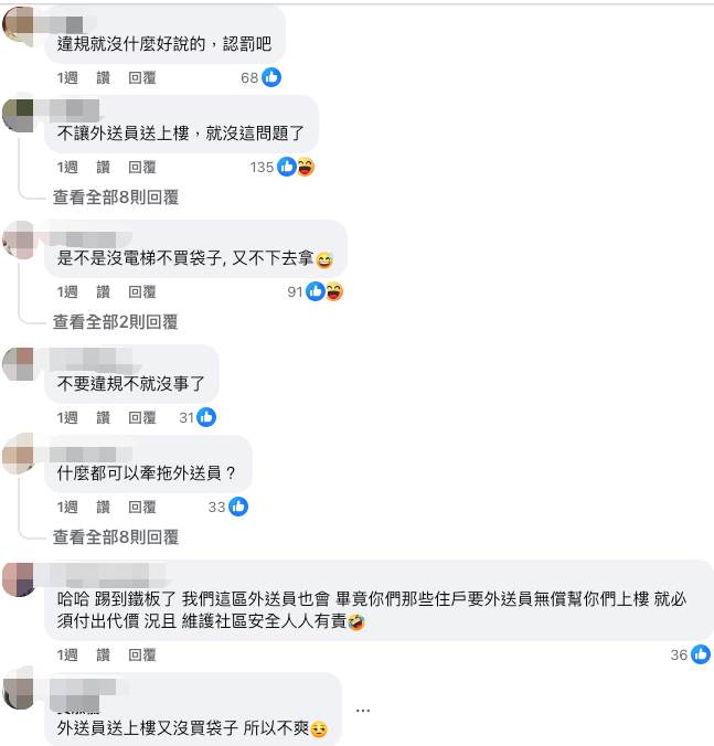 許多網友紛紛留言表態,有人說「本來就違規了,認罰比較實在」、「該不會是沒電梯又不想下樓拿才這樣搞吧」、「外送員還兼當大樓管理員,這招不錯」。甚至還有網友詢問檢舉管道,表示自己住的社群也有類似問題需要處理。