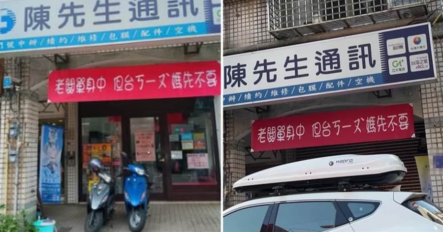 原PO日前于臉書社團「路上觀察學院」上傳一張照片,強調「客家人才懂的」,只見一間通訊行門口高掛一個紅色布條,上面用白字寫道「老闆單身中,但台ㄎㄧㄡˋ媽先不要」,從門牌地址可以發現這間店位于新竹縣。