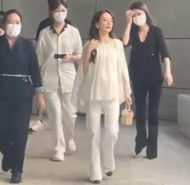方媛當天穿上白色孕婦裝,下身是同色系的修身長褲,雖然臨盆在即,卻還是「是肥肚不肥人」,完全看不出已進入孕晚期。方媛一馬當先走在最前,步行時依然十分敏捷,身后跟著6位工作人員,散發著女王般的氣場。