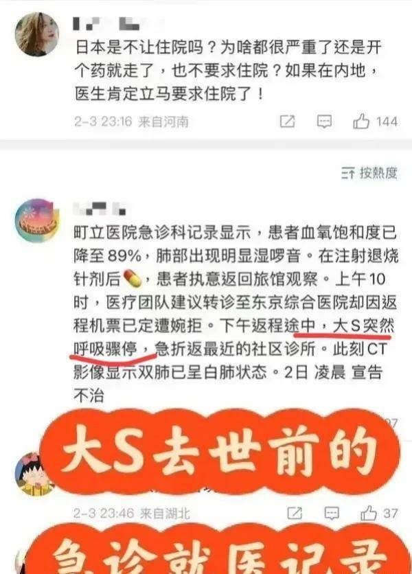 有知情網友曝光了大S的急診記錄,她的身體指標已經非常危險,醫院建議住院治療,但她堅持回賓館。