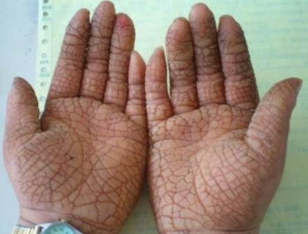 條紋狀掌跖角化病自嬰幼兒起發病,皮損主要表現為手掌處沿手指輻射狀條紋形的角化過度。多分布于摩擦和著力的部位,有時肘、膝關節伸側也可受累。