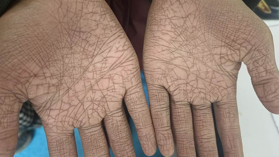 診室冷白的燈光下,十三歲少女遲疑著攤開雙手——本應柔潤細嫩的手掌赫然布滿驚人的裂痕,縱橫交錯的紋路如龜裂的旱地般布滿掌心。深深的手紋溝壑里清晰嵌著細碎的皮屑,指關節褶皺處更是密布著皸裂的紋路,整體呈現出一幅異常粗糲的「地圖地貌」。母親呼吸急促地描述,情緒崩潰。