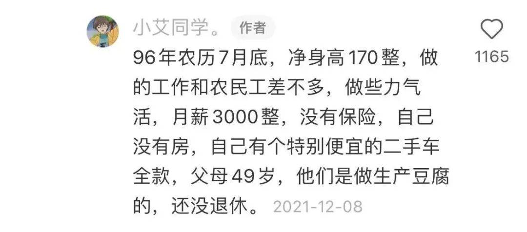 96年的,凈身高170,做的工作和農民工差不多,父母也都是普通的勞動人民。