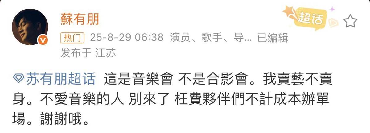 而前陣子,蘇有朋因為演唱會,發布了賣藝不賣身的言論,讓很多網友不爽!