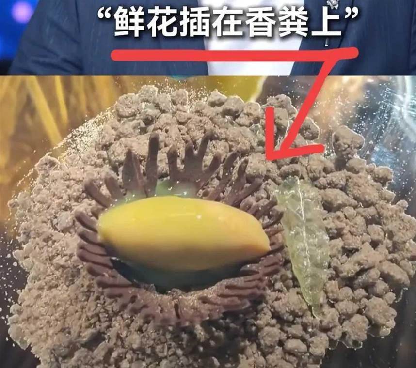 壓軸甜品「鮮花插在象糞上」經電動滑軌送桌,服務員稱「象糞經三月發酵烘焙,除菌率99%」,但褐色糊狀物的異味讓多數人淺嘗即止。