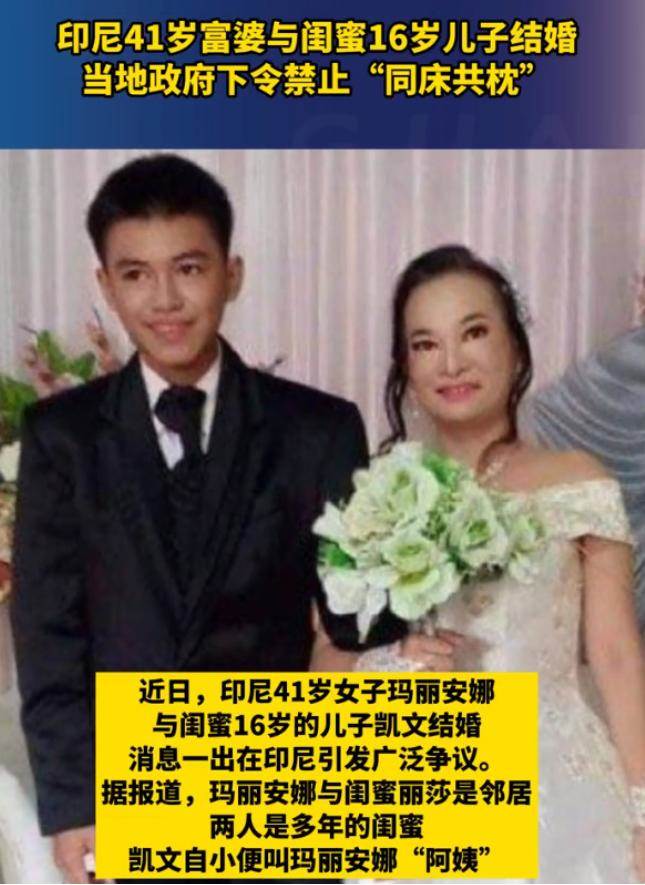 印尼一對年齡相差25歲的戀人近日引發了社會的廣泛關注和爭議。他們的身份是41歲的女子瑪麗安娜(Mariana)和她閨蜜的16歲兒子凱文(Kevin)。兩人結婚,但卻遭到了政府的干預,被下令禁止同床。