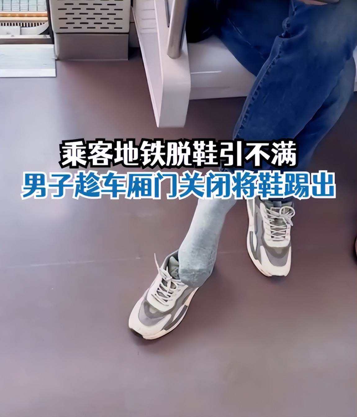 當捷運到達一個站點,即將關門時,一名乘客突然站起來,一腳把這名男子的那只鞋踢出了捷運