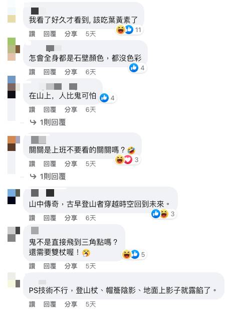 貼文曝光後,許多網友也前來朝聖,紛紛驚愕留言,「熊熊放大照片看到嚇了一跳,立刻感到毛骨悚然」、「就是穿得比較暗沉一點,說是魔神仔有點牽強」、「感覺不是人⋯⋯」、「可能就是全身穿灰色系的服裝吧」、「上次我就遇到一個背著小包包穿著短袖上衣去爬玉主,結果走在半路還不到玉山前峰就被領隊趕回來了,人家可生氣了,他說他不怕冷」、「腳是透明的欸」、「哇!超級異世界,感覺一張照片,兩個平行宇宙!」。