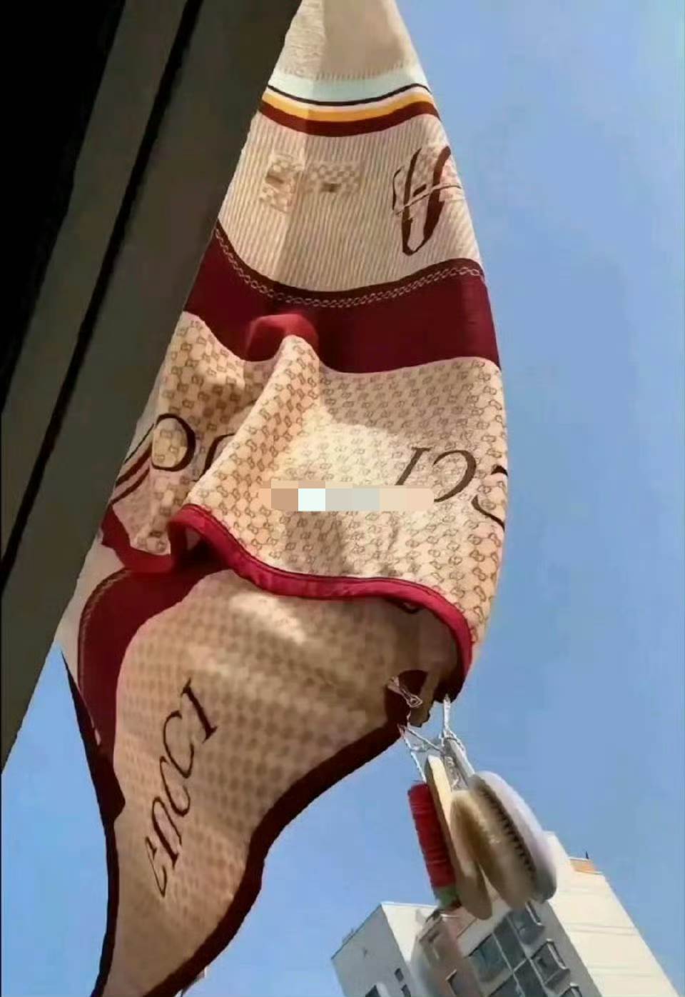 只見一條紅白配色的布料,上面印著醒目的「GUCCI」標志(圖中文字顯示為「ILCI」和「ENCI」,系特定視角或圖案設計造成的視覺差異,主體識別為GUCCI風格標志),如同一面另類的「旗幟」在風中飄蕩。