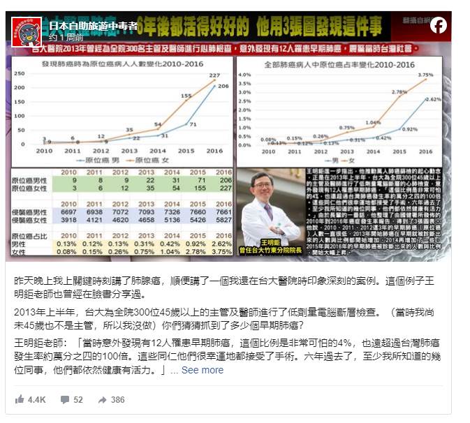 林氏璧10日在臉書「日本自助旅遊中毒者」發文提及,台大醫院2013年上半年,為全院300位45歲以上的主管及醫師進行了低劑量電腦斷層檢查,意外發現其中12人罹患早期肺癌,比例之高,是非常可怕的4%,也遠超過台灣肺癌發生率約萬分之四的100倍。