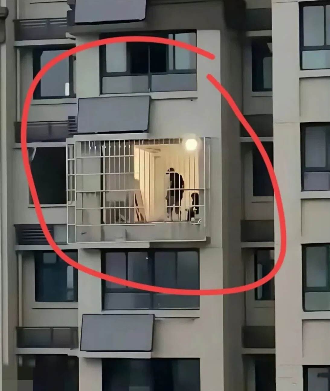 推文網友上傳了一張高層住宅照片:某住戶將陽台玻璃窗完全拆除,僅保留金屬防護網作為圍擋。對面一戶住在十六層卻裝了防盜窗,整棟樓只有這家有防盜窗顯異常,十六層高度就算有小偷也難接近,低樓層裝防盜窗能理解但此處無理。
