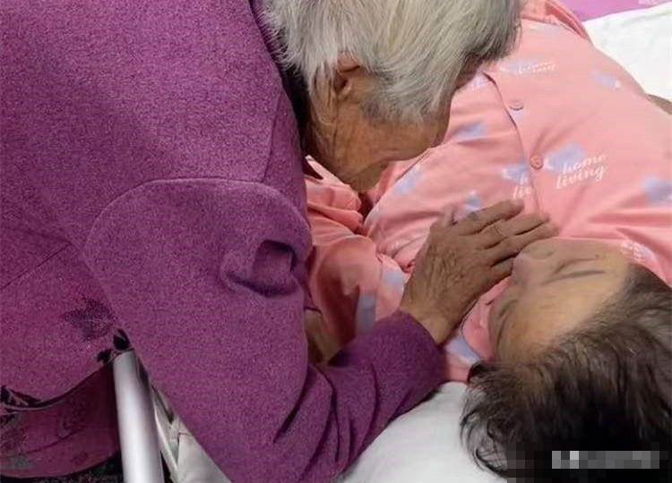 74歲老人住院好幾天了,95歲的媽媽在老家一直很牽掛,周末的時候,家人帶著她來到醫院看望患病的女兒。