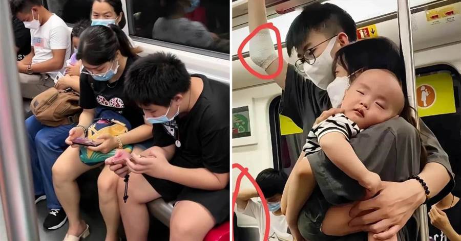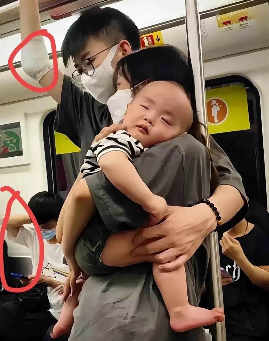 近日,一張捷運上的照片在社交平台刷屏:一位年輕媽媽抱著熟睡的女兒,身旁的爸爸用受傷的手臂輕輕護著她們。