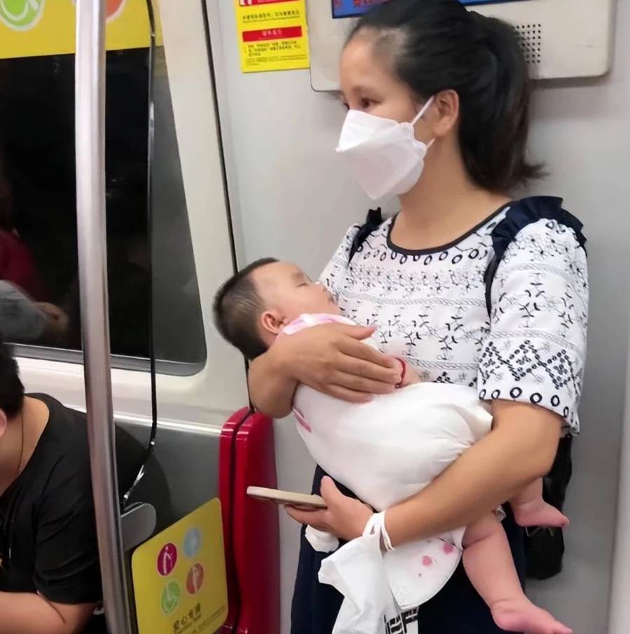 照片里,車廂并不擁擠,甚至還有空位。但這位媽媽卻穩穩地站著,雙手環抱熟睡的女兒,生怕晃動驚醒她。一旁的爸爸右臂受傷,卻仍用左手輕輕扶著妻子的肩膀,無聲地分擔著她的疲憊。他們本可以坐下,卻選擇站立——只因為不想讓熟睡的孩子占用過多空間,影響其他乘客。