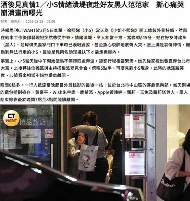 小S被兩名助理架著走出來,整個人已經站不穩了。她趴在女助理肩上,突然嚎啕大哭,哭到全身虛脫、氣若遊絲,最後癱軟在助理身上。記者隔著馬路都能聽到哭聲。