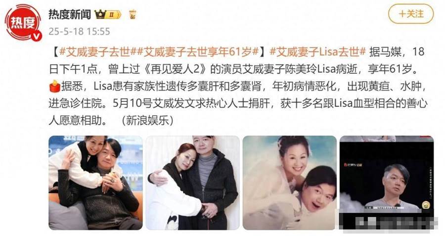 18日下午1點,一條令人心碎的消息沖上熱搜——曾參加內地芒果台綜藝節目《再見愛人2》的TVB演員艾威,其妻子陳美玲Lisa因病去世,享年61歲。這場與病魔的拉鋸戰,最終以遺憾收場,但過程中那些陌生人的善意、夫妻間的堅守,卻像一束光,照進了這個略顯冷漠的世界。