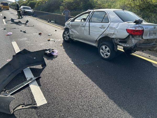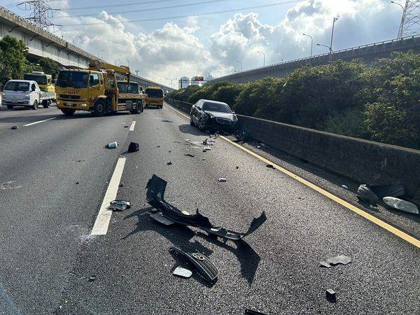 一輛銀色轎車與另一輛黑色奔馳在高速路上發生了嚴重擦撞。警消趕到時,銀色轎車已然損毀不堪,車頭幾乎完全變形,碎片散落一地,駕駛艙頂部也被嚴重撞擊。